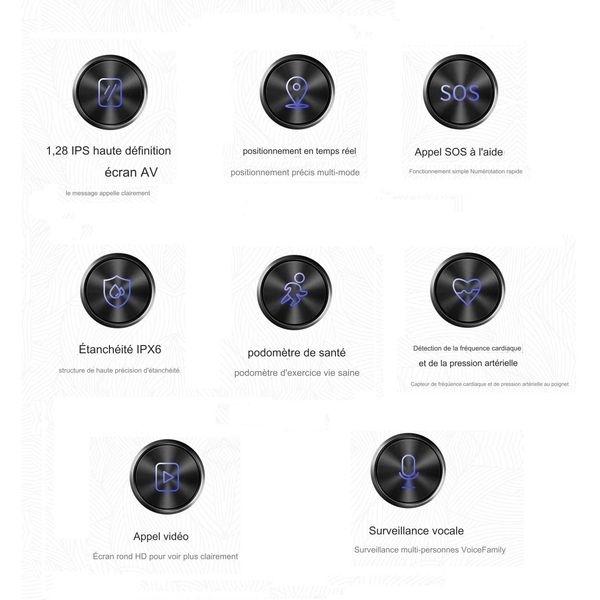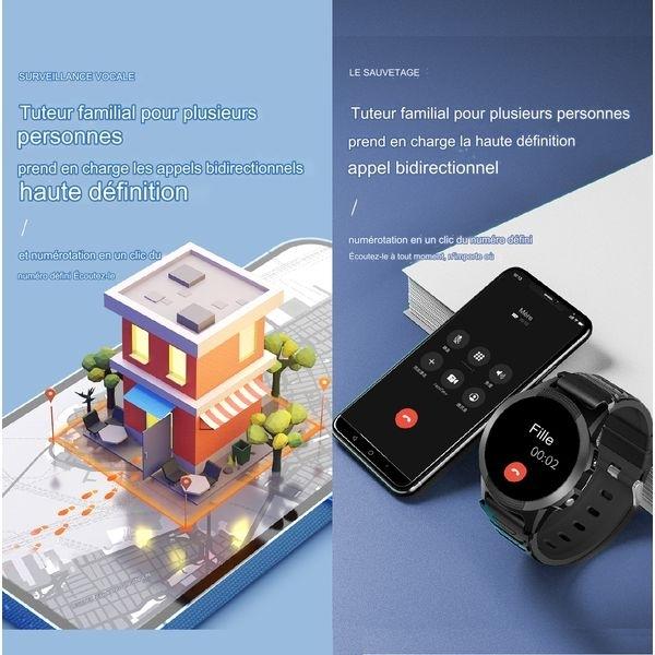 Waterproof IP67, Large screen, watch, precise GPS tracker by WI-FI or SIM card (not provided), position report, routes for 1 month, alerts, 2 days of autonomy, geo-fence alarm exceeded, communicate with the person by audio and video, free application, access to the application by several people, SOS button, two-way voice, heart rate, white list do not disturb function, French language, for the increased safety of the elderly and people with disabilities, 640 MB memory for 3 HD photos.