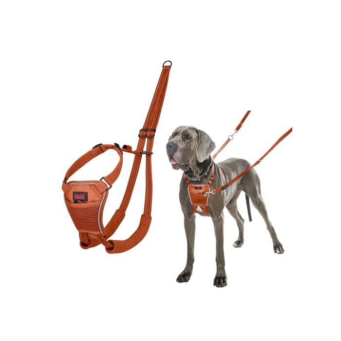The HALTI Anti-Pull Harness, designed by Company of Animals, is an effective solution for dogs who tend to pull on their leash. This model, size L and burnt orange in color, is ideal for large dog breeds. Made of polyester, it is lightweight and offers optimal freedom of movement thanks to its padded straps on the chest and front legs, thus ensuring your pet's comfort during walks.. The harness features reflective stitching and a chest piece for better visibility in low-light conditions, thus increasing your dog's safety.. Easy to put on, it is fully adjustable to fit your dog's morphology. For optimal training, it is recommended to use it with the Halti Double Clip Training Lead. The harness is hand washable only and has a one-year warranty. This product is an ideal option for flat-faced dogs who cannot wear a headcollar, and it is designed to improve your dog's behavior by reducing pulling.. With dimensions of 6.5 cm in length, 12.6 cm in width, and 20.5 cm in height, this harness is a practical and safe accessory for daily walks.. The Seller confirms that its products comply with all applicable laws and are only offered if they comply with Joom's policies and European laws on product safety and conformity.