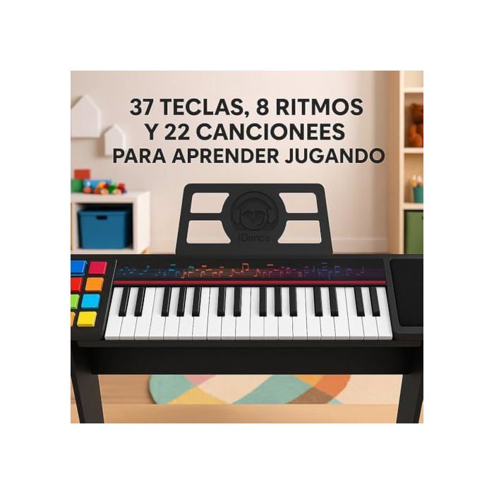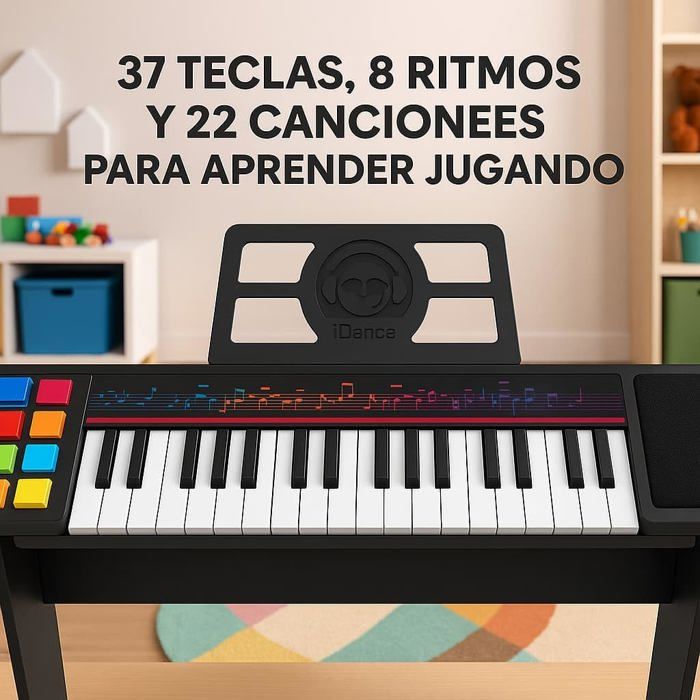 The iDance electric piano for children is designed for young musicians from 3 years old. With its 37 keys, it offers an enriching musical experience thanks to its 8 musical rhythms and 22 built-in songs, allowing children to explore various musical styles and play automatic accompaniments.. The sturdy wooden base ensures a solid and stable structure, ideal for maintaining stability during play. Its ergonomic design promotes a comfortable posture, essential for prolonged practice. The piano is equipped with a built-in stand for tablet or sheet music, facilitating digital learning and the use of interactive applications. The rechargeable USB battery offers extended battery life, eliminating the need for batteries, and its lightweight design makes it easily portable, whether at home, in class, or while traveling. This musical and educational toy stimulates auditory memory, hand-eye coordination, and concentration, making this piano a perfect tool for children who wish to discover music and play their first melodies.. With dimensions of 38 cm width, 85 cm length and 9 cm height, this plastic piano is an excellent choice for introducing children to music in a fun and modern way.. The Seller confirms that its products comply with all applicable laws and are only offered if they comply with Joom's policies and European laws on product safety and conformity.