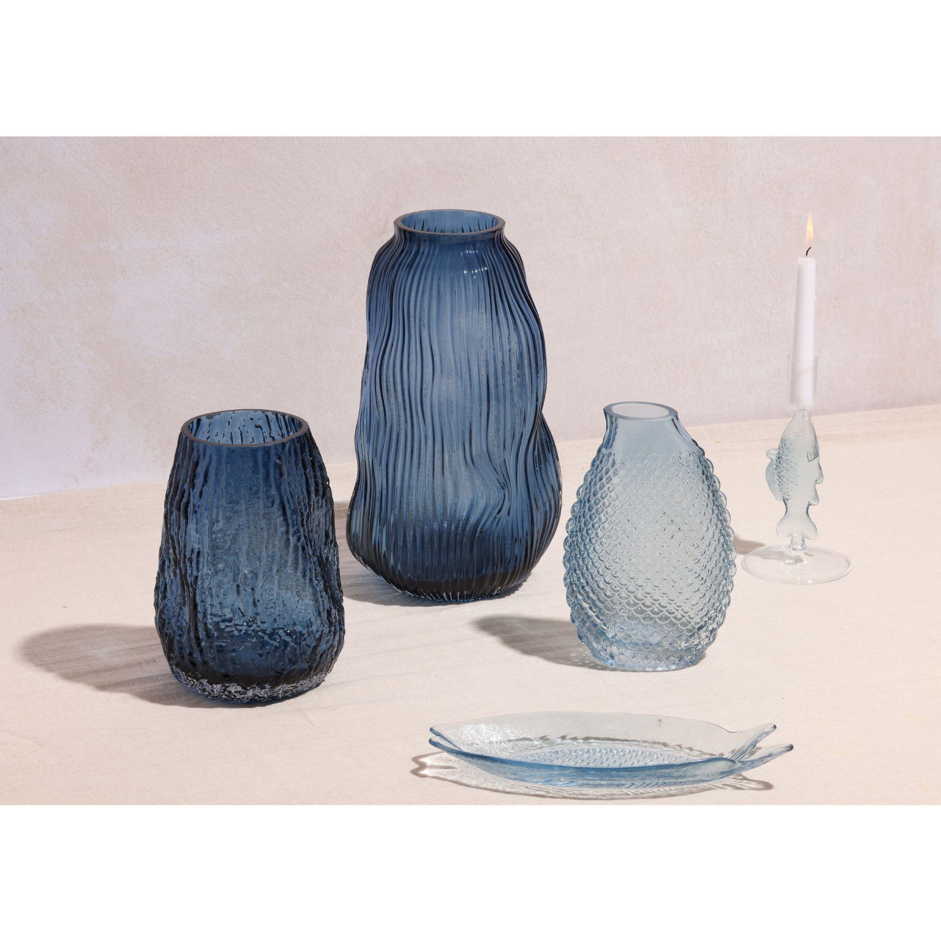 - Clear glass with a textured scalloped pattern Bold blue accent for neutral interiors Suitable for real and artificial flowersExplore more in our Hestia collection, featuring distinctive accessories to elevate your home.