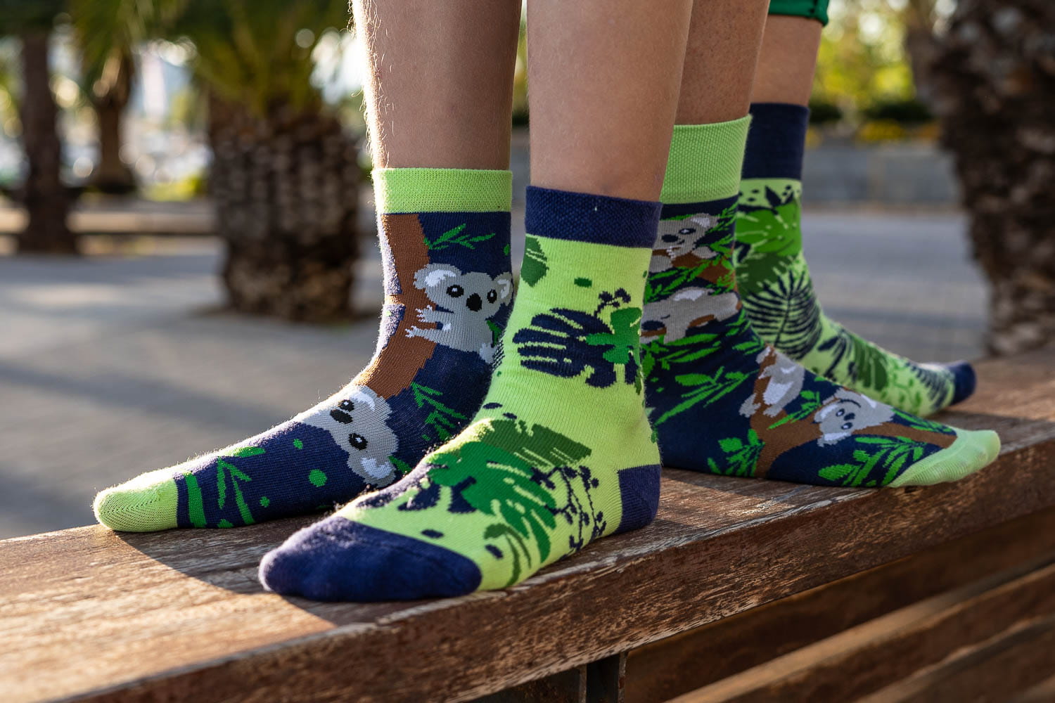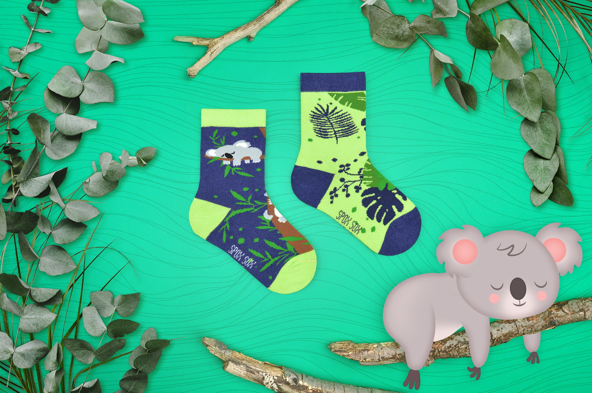 It's time to welcome newcomers from distant Australia - cheerful and cute koala bears! These sweet animals love to eat eucalyptus leaves, and their naps last for a total of 3/4 days. For little lovers of Australian bears, we have prepared children's socks in koalas! This pair is asymmetric socks - although they differ in patterns, they are connected thematically and in color. Sock number 1 is koala bears resting in a tree after eating. Did you know that they spend almost all their lives in trees? In turn, the other half of this pair is the favorite delicacy of these jets, i.e. juicy eucalyptus. Cute baby socks with koalas These cute socks come in three different sizes, making them suitable for children aged 2 to 10 years. Parents will probably be pleased with this information - children's socks with koalas can be washed in the washing machine and nothing will happen to them! They will not shrink, the pattern will not smudge or wear off, and the material will still remain pleasant to the touch, thanks to high-quality combed cotton. Australian little teddy bear on socks Every toddler who, like a koala, likes to climb trees, will be delighted with such socks! Koala bears often appear in fairy tales, and children simply love them. So if you are wondering if koala socks for children will be a good gift, the answer is yes! What else have we prepared for the youngest animal lovers? Among others, children's socks with cats, as well as typical autumn children's socks with squirrels. :