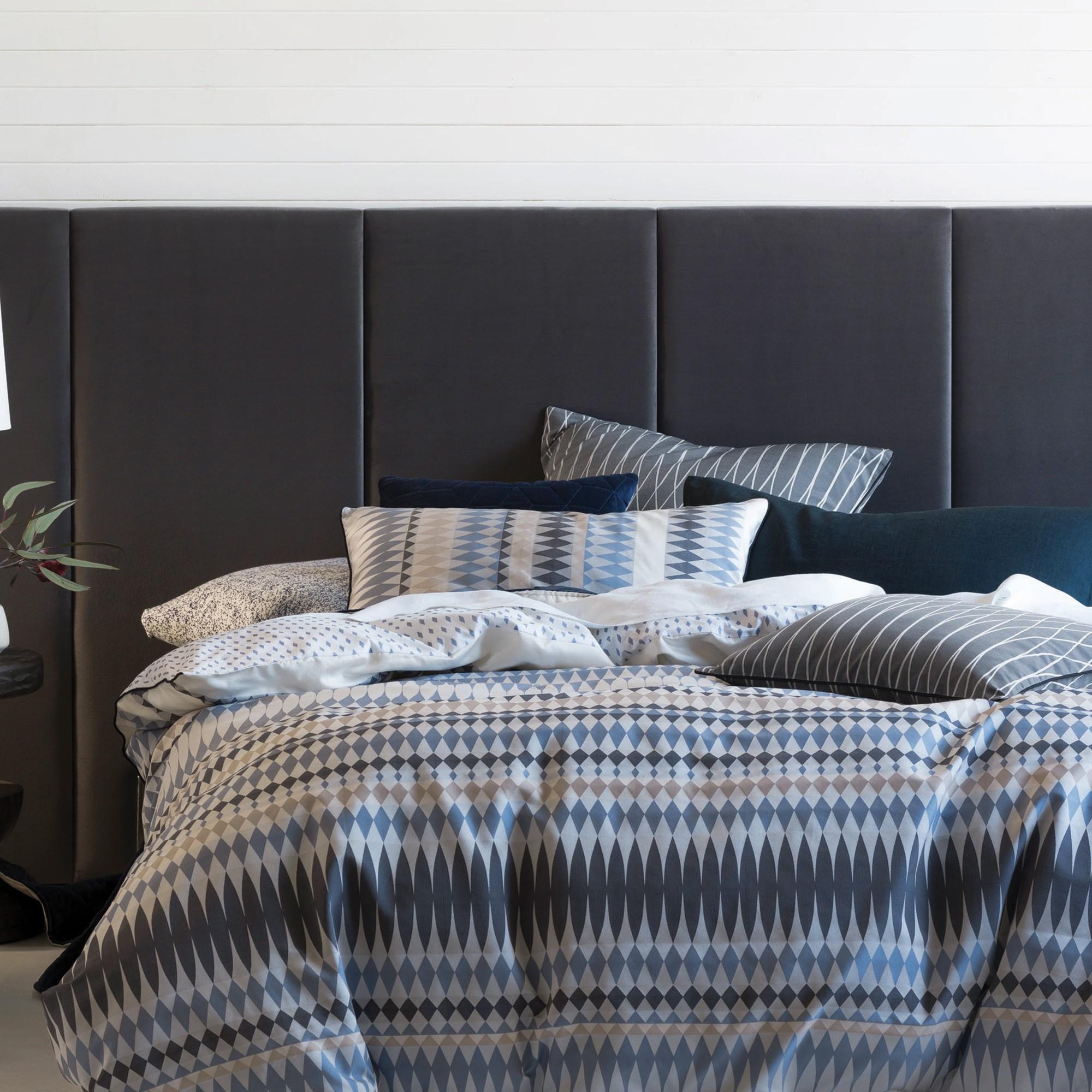 - The Linen House Northbrook pillowcases fit seamlessly into this look with their geometric diamond design in blue, white, cream and taupe chambray tones.