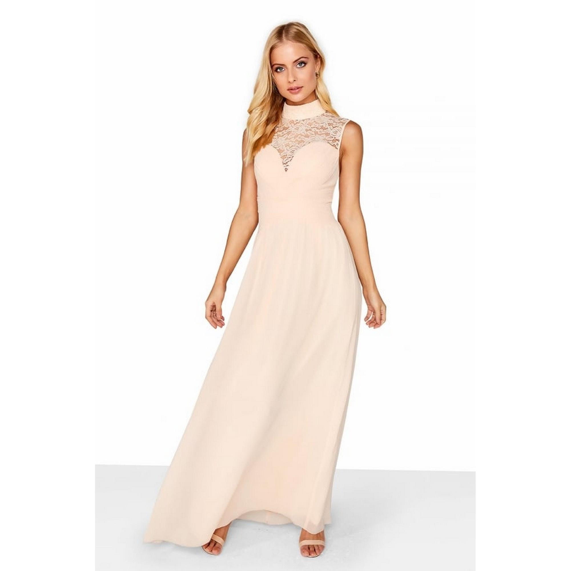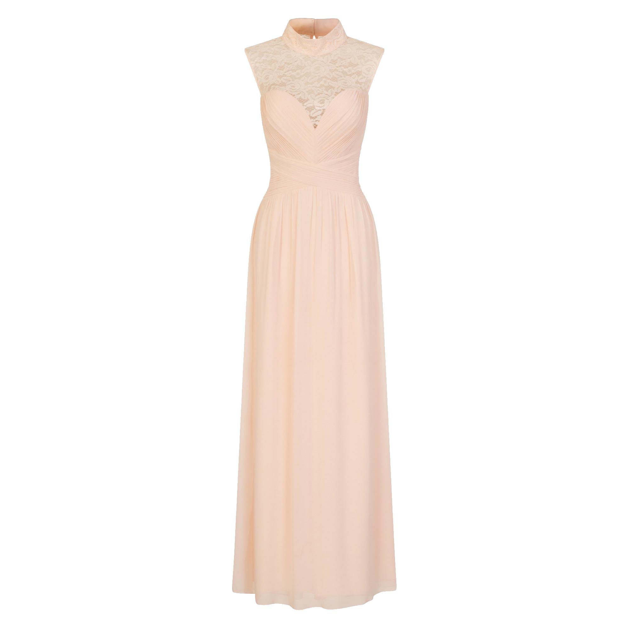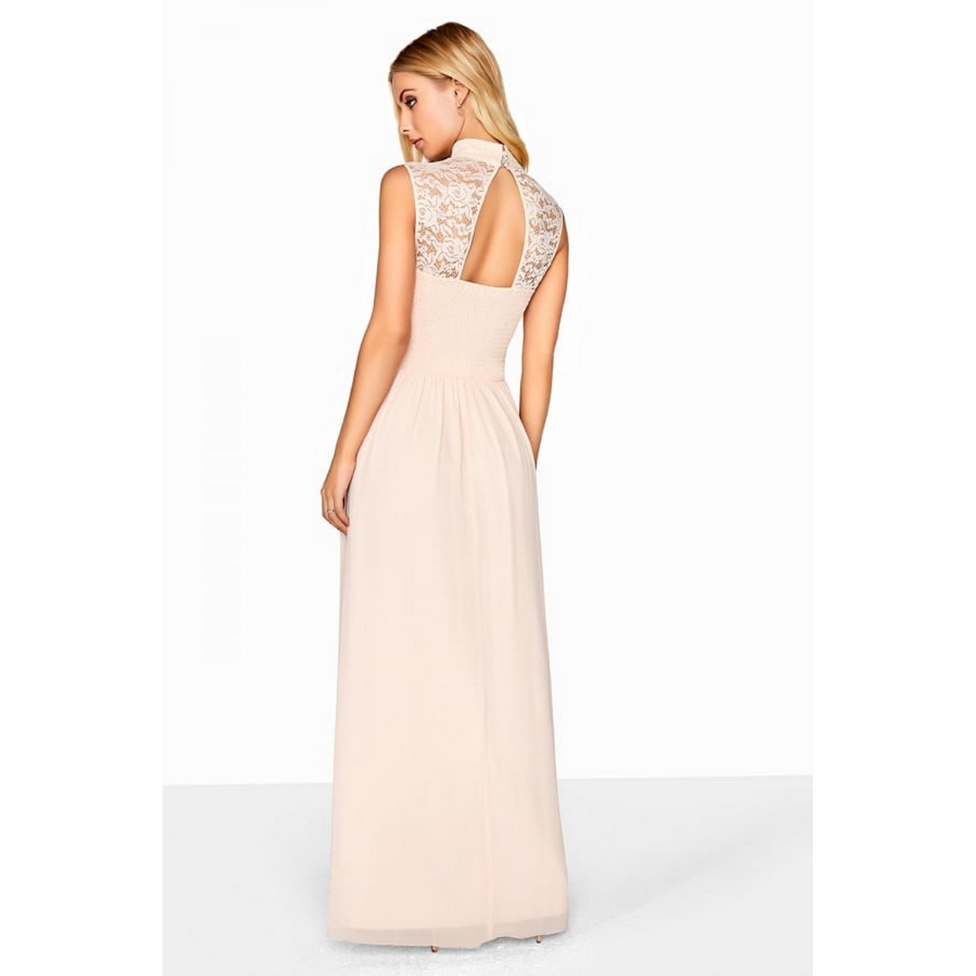 - A high neck maxi dress with gathered bust and foiled lace yoke.