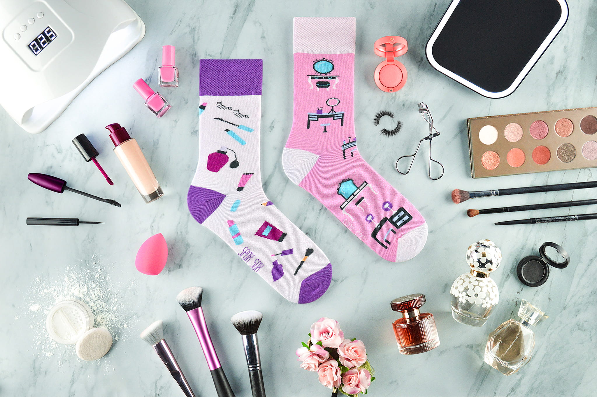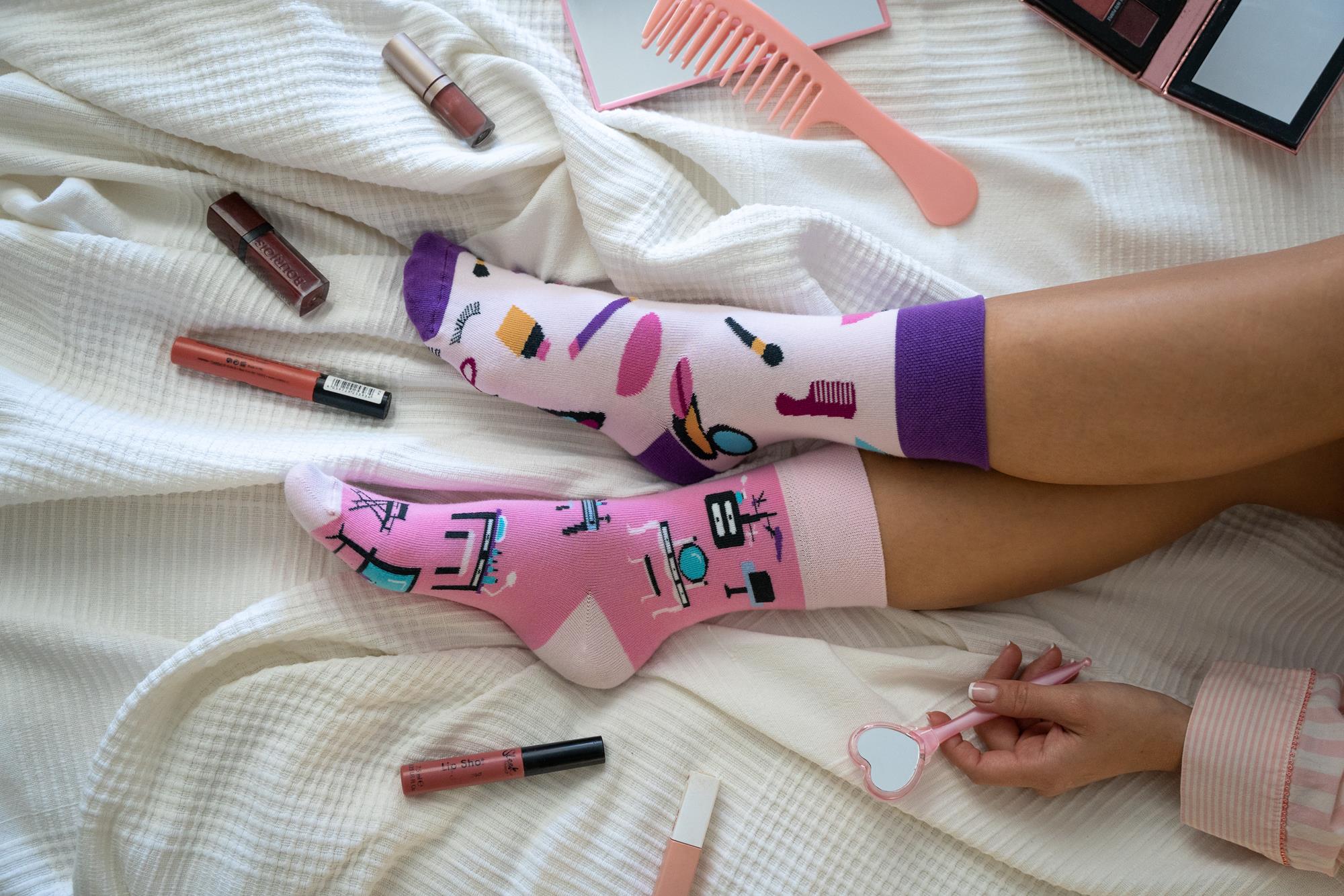 Make-up cosmetics have appeared not only in cosmetic bags, but also on socks! Are you looking for a gift for your girlfriend or friend, then check out our lipstick socks. Just like classic lip glosses or mascaras, they will decorate all stylizations!  What makes lipstick socks stand out? The socks have eye-pleasing colors - pink and purple work very well together, creating an unusual combination. By design, women's socks are made as if they were from separate pairs. One of them is pink with white elements, while the other is purple. This creates a very fashionable effect of a fitted mismatch. They can make even the simplest styling take an original breath! One of the socks has a more pronounced accent of makeup accessories - a vanity case with a mirror or a desk with a LED lamp, referring to the modern way of applying makeup. The second one has already drawn specific make-up products, such as mascara, lipstick or eyeliner. Thanks to the combination of all aspects related to makeup, they will be a great gift for someone who creates makeup professionally or as a hobby!  What can you choose socks for cosmetics?  All our products are created to bring both comfort and joy of wearing. Following the guiding principle that a woman buys cosmetics, flowers or chocolates, we recommend buying socks with bees and honey or party socks to the set. Together they will create a gift that no woman can resist! Remember - the lipstick will wear off, the wine will eventually be drunk, and the chocolate will quickly disappear. However, the drawings on our socks do not disappear and will remind her of you for a long time. :