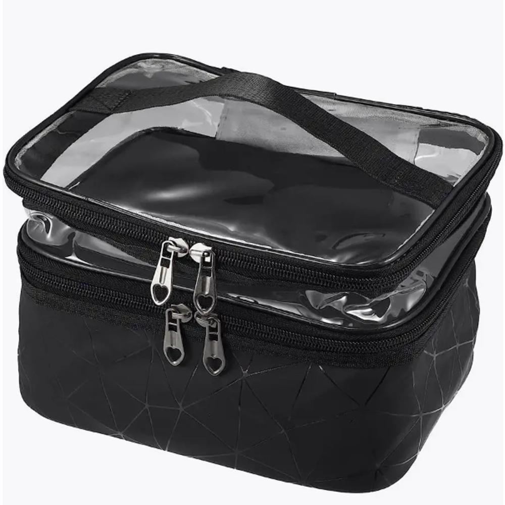 Transparent top for quick and easy access to your essentials. Two-tier design for organizing and separating items efficiently. Durable, water-resistant material for added protection. Reliable zippers for secure closure. Compact yet spacious – ideal for travel or daily use.