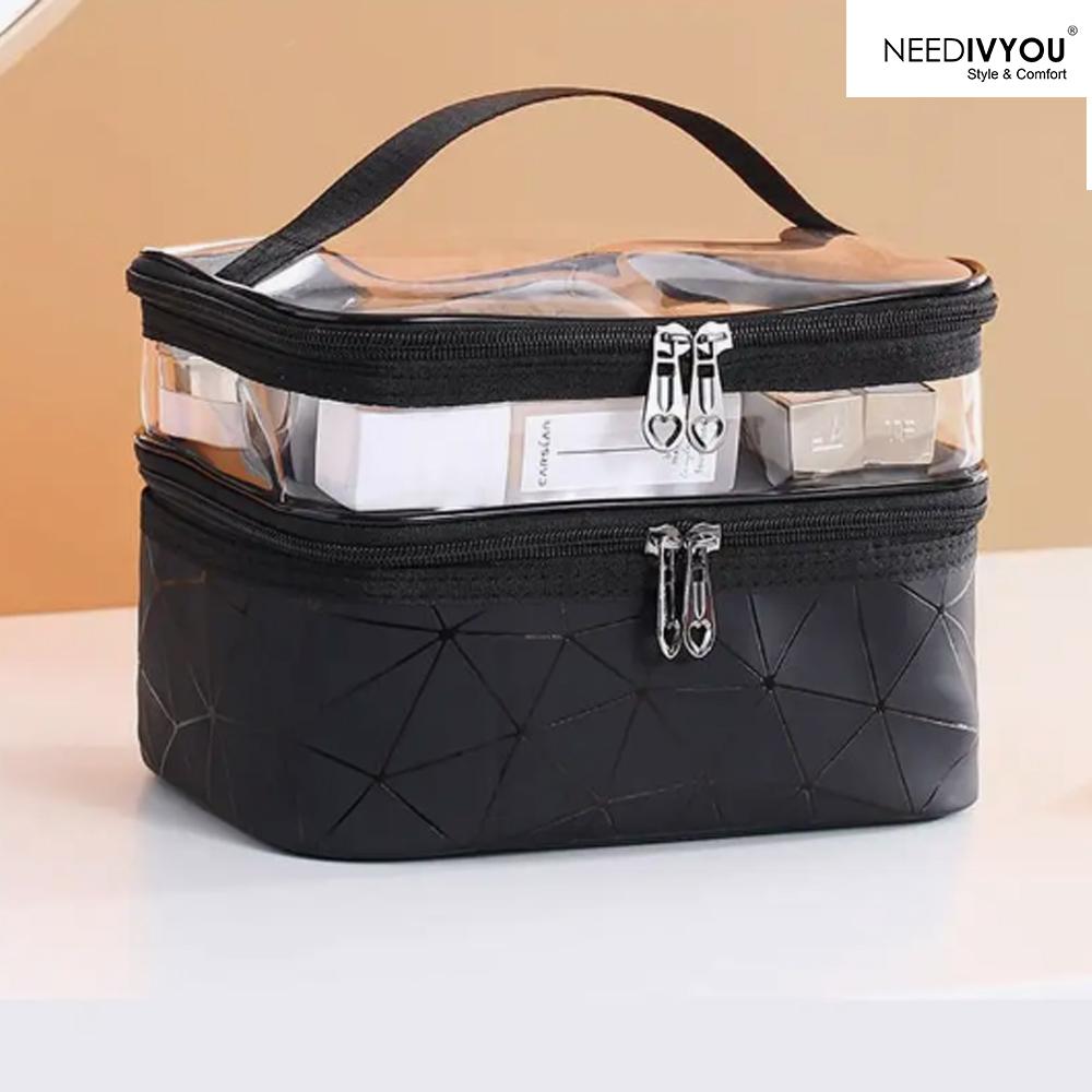 Upgrade your travel routine with the NEEDIVYOU Black Double-Layer Cosmetic Bag. Designed with a transparent top for easy access and a two-tier structure, this organizer offers maximum efficiency by allowing you to separate your beauty essentials. The compact yet spacious design provides ample storage for cosmetics, skincare, and toiletries, making it perfect for travel or everyday use. Made from durable, water-resistant material, this cosmetic bag protects your items from moisture and ensures long-lasting use. Its reliable zippers and convenient handle add practicality, making this bag the ideal companion for any adventure.