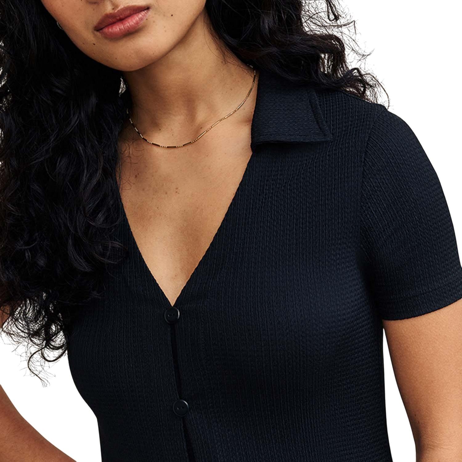 - Neckline: Collared, V Neck.