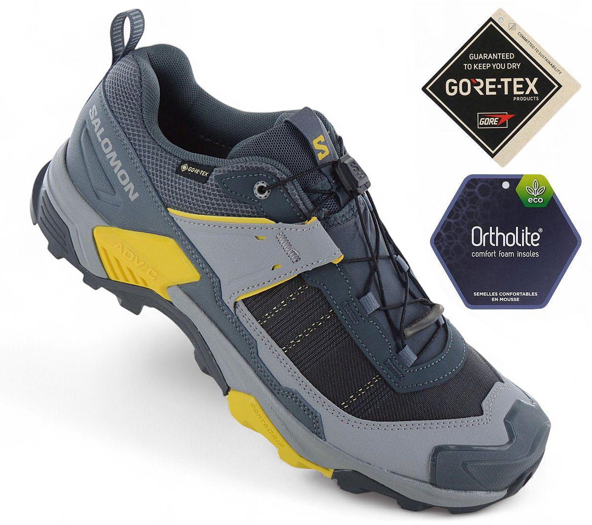 Salesperson: WE, THE COMPANY BRANDSTYLE24, HAVE BEEN SELLING ORIGINAL BRANDED SHOES ON THE INTERNET FOR 20 YEARS. OUR GOODS ARE ALWAYS 100% ORIGINAL! (GUARANTEE OF AUTHENTICITY) *** Guaranteed 100% authentic Salomon goods! *** We do not sell fakes. *** Manufacturer color: Turbulence / Monument / Spicy Mustard upper: Mesh / synthetic condition: New and in original packaging The Salomon X Ultra 5 GTX is a reliable companion for hikes in any terrain. This lightweight yet sturdy hiking shoe offers optimal protection against moisture thanks to the GORE-TEX membrane and keeps your feet dry even in rain and muddy conditions. The Contagrip sole provides excellent grip and traction on different surfaces, while the Advanced Chassis combined with Active Support provides lateral stability without restricting freedom of movement. The Quicklace lacing system allows for quick and easy putting on and taking off, and the lace pocket prevents the laces from getting in the way while hiking. The shoe is ideal for day trips, easy hiking trails as well as mixed, muddy, rocky and wet terrain. Matryx® upper material: The high-performance textile includes individually coated, high-tensile Kevlar® and technical yarn. Does GORE-TEX® keep your feet dry? from outside and inside. SensiFit: encloses the foot from the midsole to the lacing system. EnergyCell: A high performance EVA foam that provides shock absorption. Excellent grip and traction with Contagrip sole. Stability and agility through Advanced Chassis and Active Support. High wearing comfort and protection for long hikes. Robust and durable upper material. Stitched tongue - The tongue is connected to the upper on both sides. Quick lacing system. Molded OrthoLite® insole. Suitable for various types of terrain. .