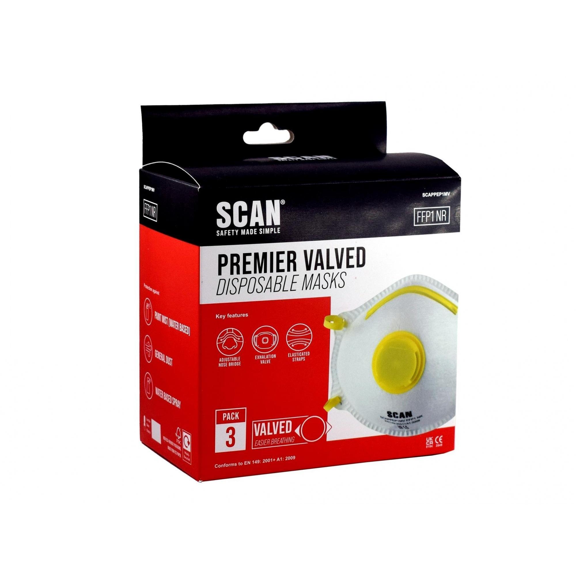 - Scan Premier Valved Disposable Masks with an exhalation valve to make breathing easier and an adjustable nose clip with soft foam nosepiece giving a custom fitting.