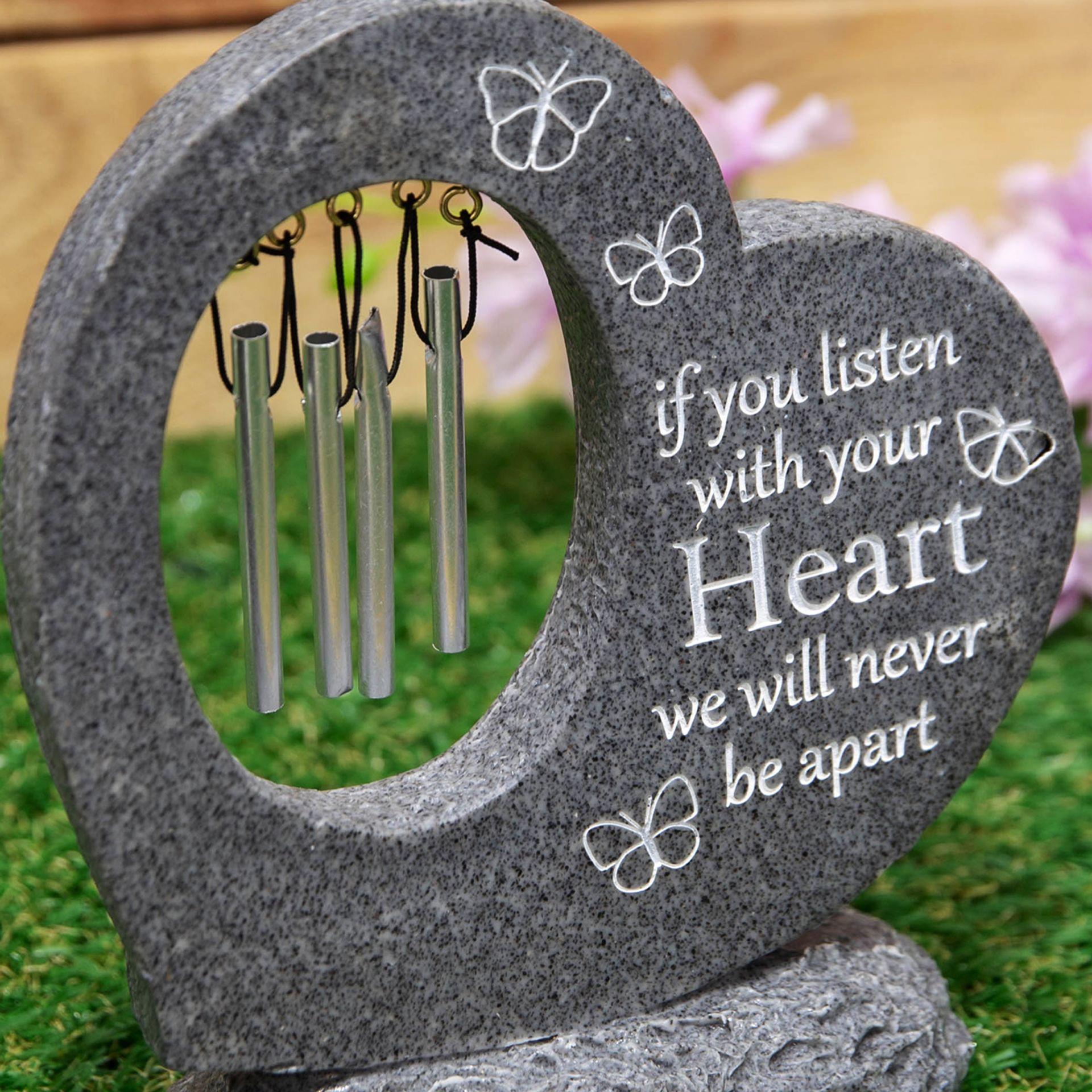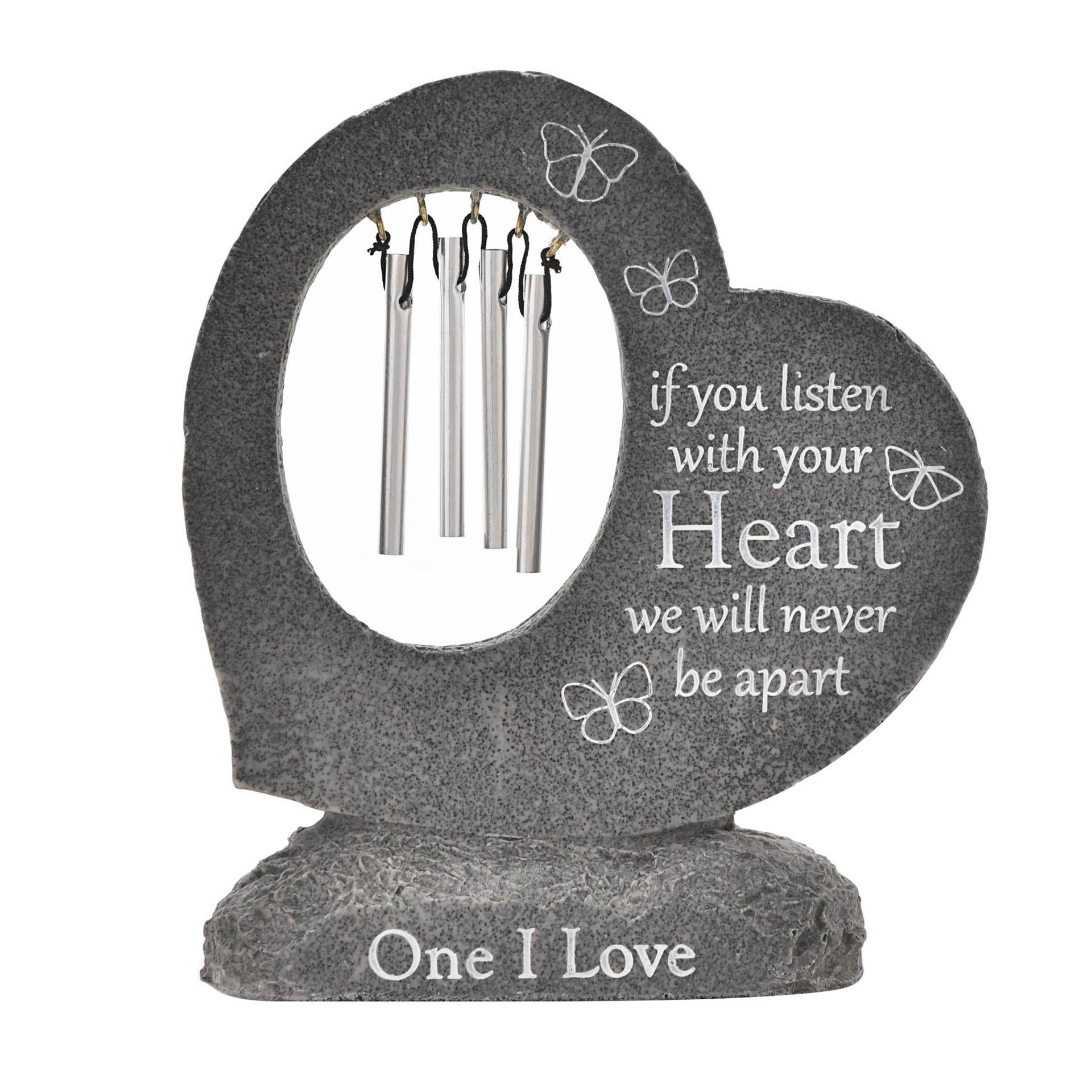 - A graveside stone heart windchime from Thoughts of You by CELEBRATIONS.This touching stone provides a heartfelt way to remember partners who will never be forgotten.The realistic faux marble memorial stone features a grey, weather resistant finish, complete with silver One I Love engraving on the base and If You Listen with Your Heart sentiment on the heart, alongside butterfly decoration.